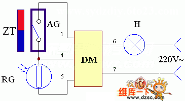 該裝置應(yīng)用電路工作原理如圖3。它可用于倉庫、辦公室或其它場(chǎng)所作開門燈之用。當(dāng)永久磁鐵ZT與干簧管AG靠得很近時(shí),由于磁力線的作用,使AG內(nèi)兩觸片斷開,控制器DM的④端無電壓,照明燈H中無電流通過,故燈H熄滅。一旦大門打開,控制器DM開通,H點(diǎn)亮。