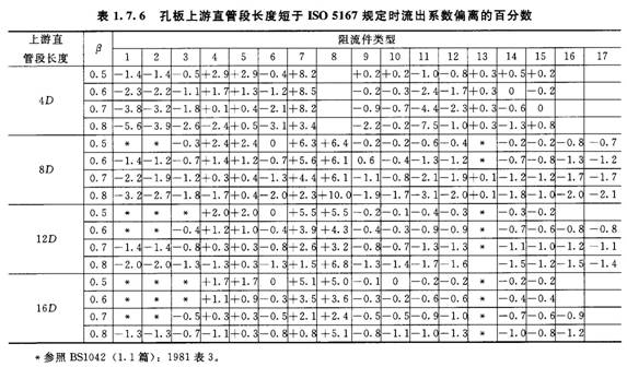 當節流件上游側直管段長度不符標準規定時,流出系數將發生變化。表1.7.6及表1.7.7列舉若干流出系數偏差的估算值及其附加不確定度。