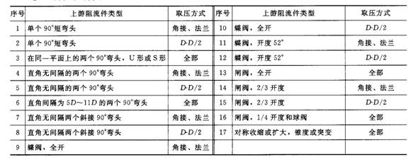 表1.7.5所示為節流件前后裝設異徑管。由表可見,在節流件前裝設漸擴管會引起很大的測量誤差,而在節流件前后裝設漸縮管,只要漸縮管夾角不大,流出系數的偏離可小于2%。