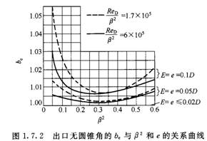 孔板開孔圓筒形部分長度e不論其出口是否有圃錐角,均應小于或等于0.02D.對角接取壓標準孔板,當e>0.02D時,應進行修正,其修正系數為be.be與ReD無關,僅與e和B2有關。但是,出口有圓錐角的孔板和無圓錐角的孔板,其be值是不同的,如圖1.7.2和圖1.7.3所示。這兩張圖可采用線性內插,但不得外推。