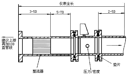 成套安裝,包括前后直管段,流動調整器等是保證獲得高精確度測量的一個措施,特別這些裝配在制造廠進行更能保證安裝的質量,圖21所示為一安裝實例。
