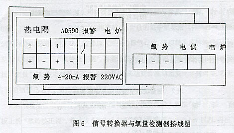 信號(hào)轉(zhuǎn)換器盤裝于控制室,氧量檢測(cè)器安裝于現(xiàn)場(chǎng),它們之間連接線有:氧勢(shì)信號(hào)線兩根采用RVVP2×1.5帶屏蔽二芯電纜線敷設(shè)、電偶冷端補(bǔ)償導(dǎo)線兩根,采用K分度KX-G型2×1.5帶屏蔽二芯補(bǔ)償導(dǎo)線敷設(shè)、電爐加熱線兩根,采用RVVP2×2.5二芯電纜線敷設(shè)。 信號(hào)轉(zhuǎn)換器與氧量檢測(cè)器之間的接線見圖3。