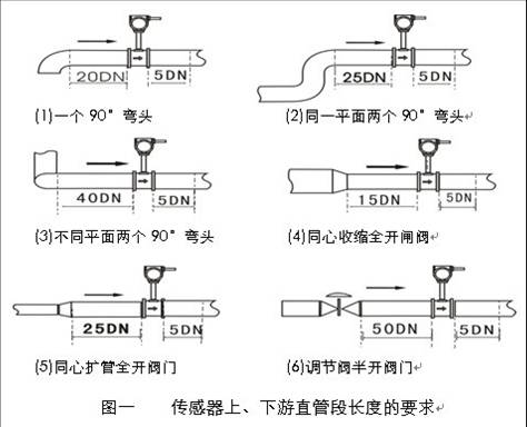 2、渦街流量傳感器的上游側和下游側應有較長的直管段。其上、下游直管段長度根據(jù)管道狀況不同而不同,直管段的具體安裝長度和要求見下圖。