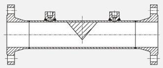 楔形流量傳感器結構如右圖所示。楔形流量傳感器的檢測件是楔形孔板,它是一塊V形節流件,它的圓滑頂角朝下,這樣有利于含懸浮顆粒(粉塵、泥沙及其它固體顆粒)流體和高粘度液體流過時在節流件上游側不會產生滯流,也不會在節流體上、下游側發生固體顆粒或粘稠物的積存,從而確保了楔形流量傳感器長期運行精度在0.2級,這樣高的長期運行精度在流量測量領域是迄今少見的。