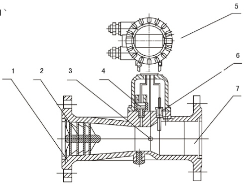 1、殼體2、旋渦發(fā)生體3、流量傳感器4、壓力傳感器5、流量積算儀6、溫度傳感器、7、導流體